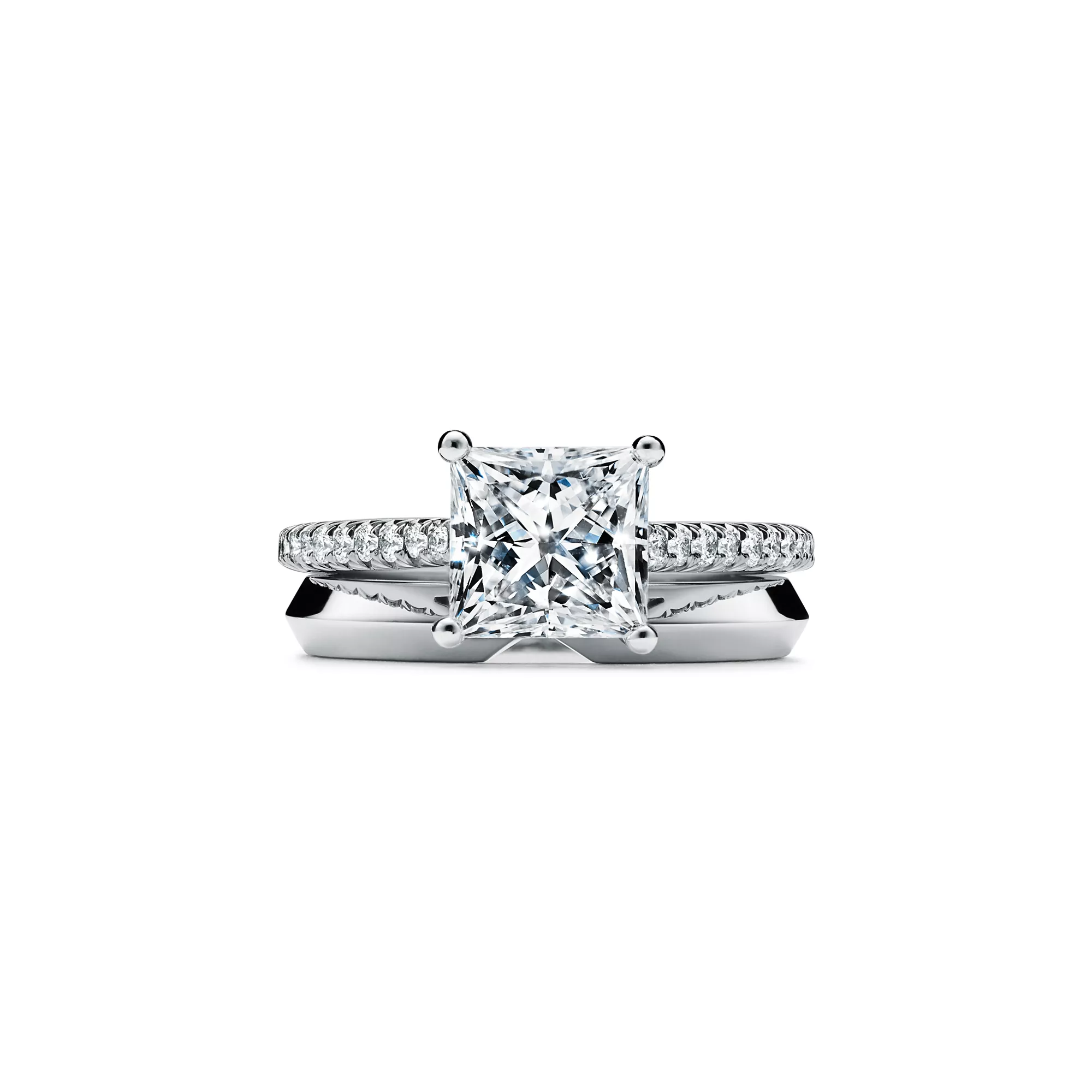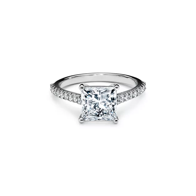 Der Diamant in der Mitte im Prinzess-Schliff – mit langen, winkelförmigen Facetten auf Brillanz geschliffen – wird von vier schmalen Krappen umgeben, was diesem zeitlosen Ring mit klaren modernen Linien eine feminine Note verleiht. Ein zierliches Band aus winzigen Diamanten in Pavé-Fassung verleiht dem funkelnden Tiffany Novo® eine romantische Sensibilität mit modernem Akzent.