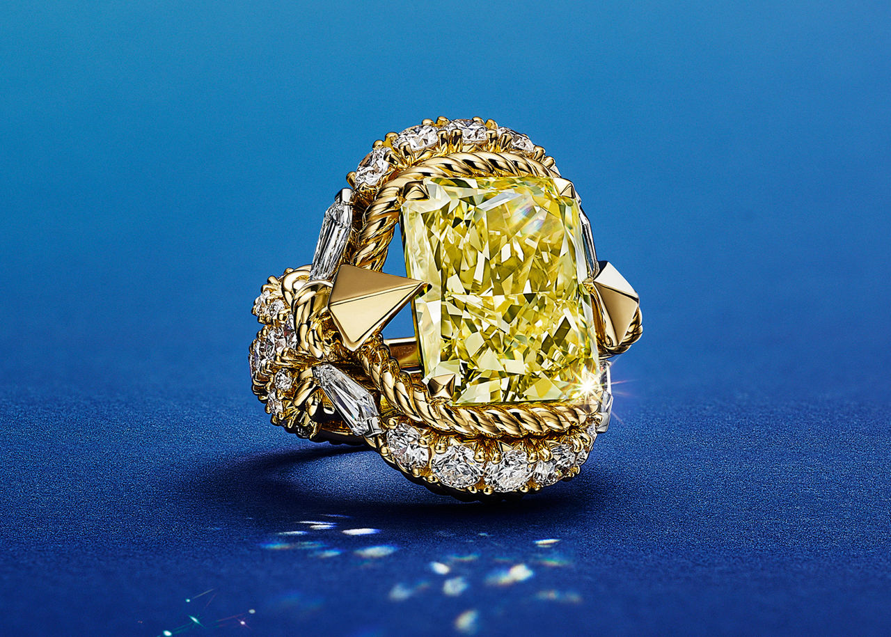 Das Motiv des Pfeils, der wie von einem gespannten Bogen abgefeuert durch den Himmel fliegt, wird in Form von wiederholten, verschlungenen Mustern, die seine Geschwindigkeit symbolisieren, neu interpretiert. Ein herausragendes Design in diesem Kapitel ist eine atemberaubende Halskette mit einem Fancy Intense Yellow Diamanten von insgesamt über 18 Karat und gelben und weißen Diamantenakzenten.