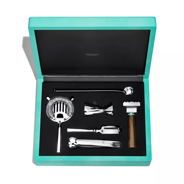 Tiffany Facets ist von vielen Facetten inspiriert: unserer Verbindung zu New York, unserem weltweiten Vermächtnis des Versprechens der ewigen Liebe sowie unserer Kompetenz als führender Anbieter von außergewöhnlichen Diamanten und farbigen Edelsteinen. Dieses Set mit Barzubehör aus Holz enthält ein Sieb aus versilbertem Messing, einen Messbecher, eine Eiszange, einen Cocktaillöffel, einen Schäler und einen Eisstempel.