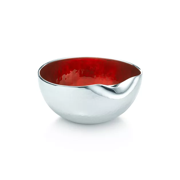 Das Thumbprint Design ist eine von Perettis berühmtesten Kreationen. Schüssel in Sterlingsilber mit von Hand aufgetragener, roter Emaille-Glasur. Durchmesser 12,7 cm. Copyright der Originaldesigns bei Elsa Peretti.
