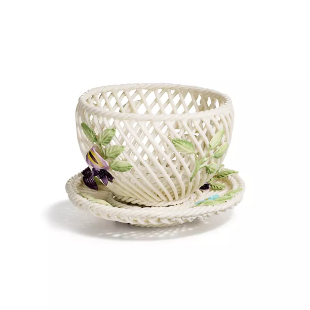 Die meisterhaft aus edlem Porzellan gefertigte Tiffany Wildflower Kollektion besticht mit einem filigranen Blumenmotiv, das durch Nuancen des für das Haus charakteristischen Tiffany Blue® akzentuiert wird. Diese von Kunsthandwerkern handbemalte geflochtene Schale mit Untertasse bereichert jeden gedeckten Tisch.