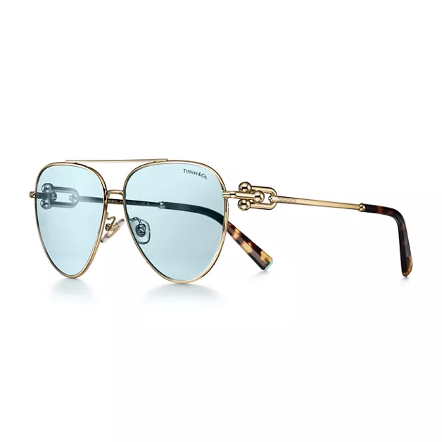 Die Tiffany HardWear Kollektion ist inspiriert vom Lebensgefühl und der Energie New Yorks. Auf der Basis der Design-Codes, die die Schmuckkollektion prägen, setzt diese Sonnenbrille mit dem charakteristischen Verbindungsglied einen markanten Akzent. Die grafischen und außergewöhnlichen Fassungen sind meisterhaft aus blassgoldfarbenem Metall und Gläsern in Tiffany Blue® gefertigt.