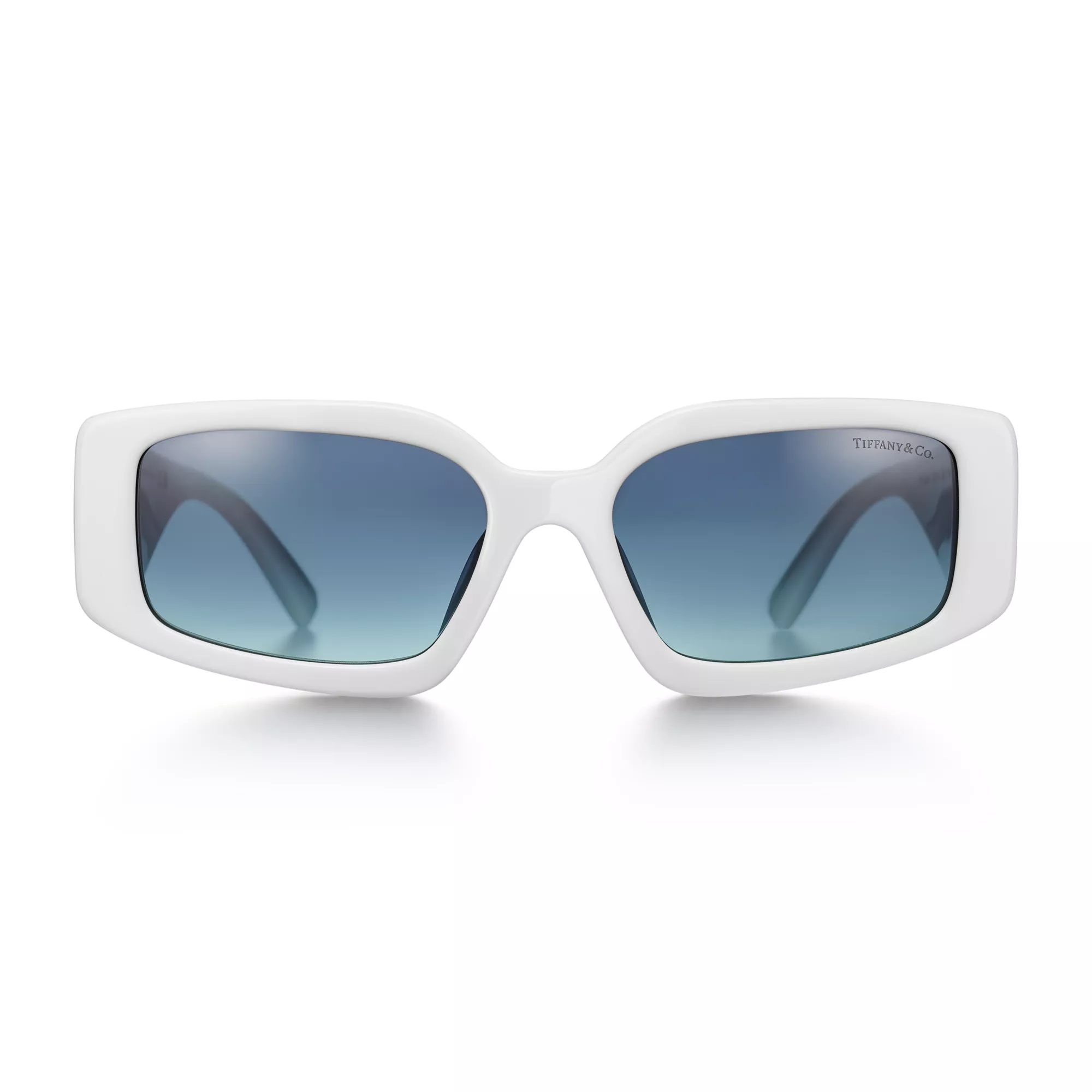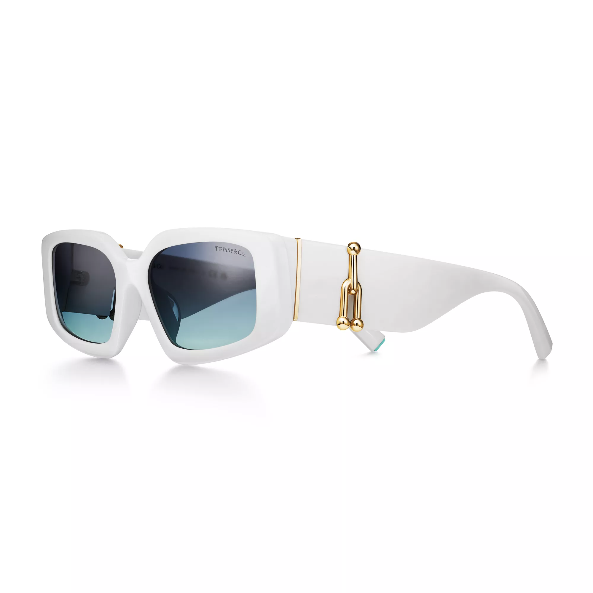 Die Tiffany HardWear Kollektion ist inspiriert vom Lebensgefühl und der Energie New Yorks. Auf der Basis der Design-Codes, die die Schmuckkollektion prägen, setzt diese Sonnenbrille mit dem charakteristischen Verbindungsglied einen markanten Akzent. Die grafischen und außergewöhnlichen Fassungen sind meisterhaft aus weißem Acetat und mit Gläsern mit azurblauem Farbverlauf gefertigt.