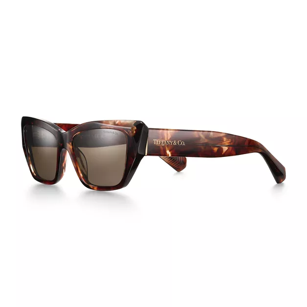 Diese Tiffany & Co. Sonnenbrille besticht mit einer facettierten Cat-Eye-Form und eleganten Details, die ein extravagantes Statement setzen. Dieses Modell ist aus Acetat in Schildpatt mit hellbraunen Gläsern in Cat-Eye-Form gefertigt.