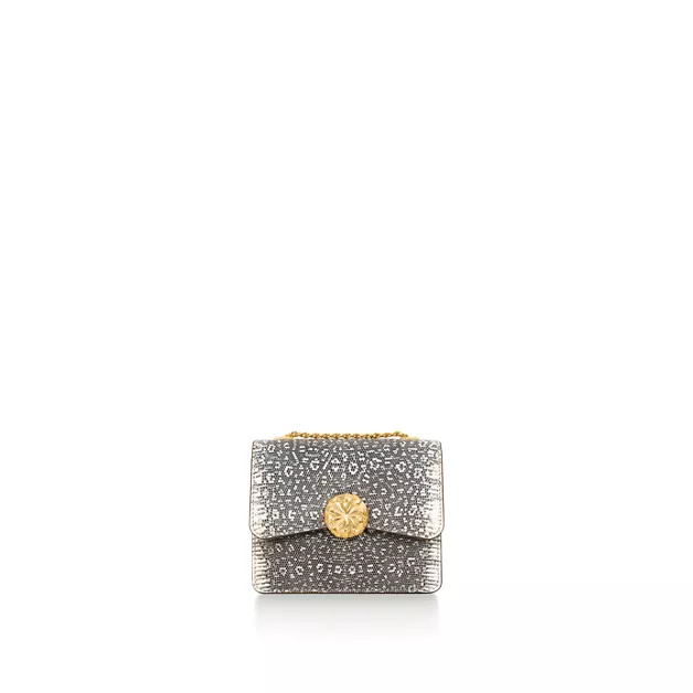 Die Jean Schlumberger by Tiffany Ribbons Kollektion ist inspiriert von der Familiengeschichte des legendären Designers in der Textilindustrie und den kunstvollen Verzierungen, die er häufig in seine Kreationen integrierte. Diese Tasche aus Eidechsenleder verfügt über ein in Tiffany Blue® gefüttertes Einschubfach vorne und ein Innenfach auf der Rückseite mit abnehmbarem Spiegel. Der Verschluss aus vergoldetem Messing erinnert an ein Motiv, das auf einem von Jean Schlumberger im Jahr 1957 entworfenen Kosmetikspiegel zu sehen ist.