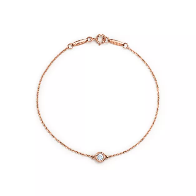 Die runden Tiffany-Diamanten fangen das Licht ein und lassen es tanzen. Armband in 18 Karat Roségold mit einem runden Brillanten. 18,5 cm lang. Karatgewicht 0,10. Copyright der Originaldesigns by Elsa Peretti.