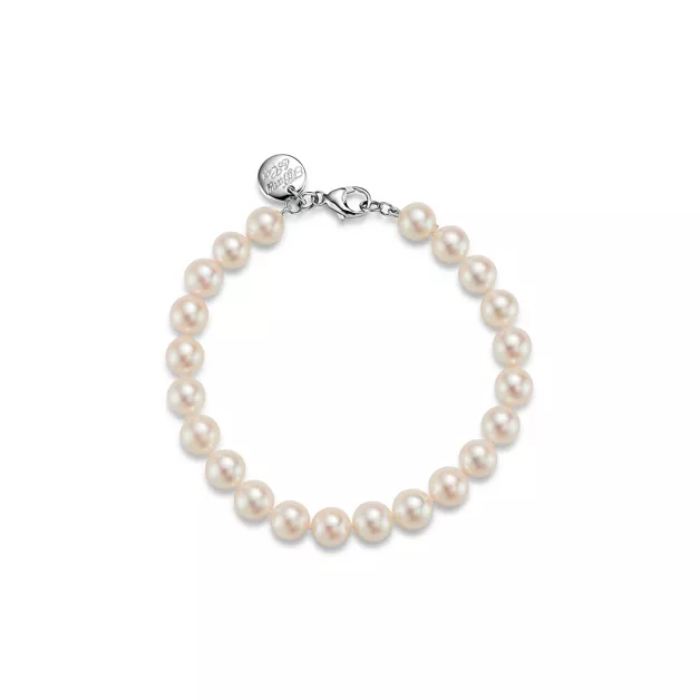 Armband aus Akoya-Zuchtperlen mit einem Verschluss in 18 Karat Weißgold. 19,1 cm lang. Am dekorativen Schild in Sterlingsilber ist der Schriftzug „Tiffany & Co.“ eingraviert. Perlen, 7 bis 7,5 mm.
