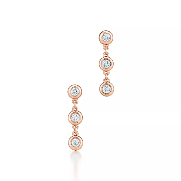 Die runden Diamanten von Tiffany fangen das Licht ein und bringen es zum Tanzen. Ohrhänger aus 18 kt. Roségold mit sechs runden Brillanten, für durchstochene Ohren. Gesamtkaratgewicht 0,28 kt. Copyright der Originaldesigns by Elsa Peretti.