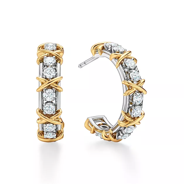 Sixteen Stone by Tiffany gilt als Symbol der nährenden Kraft der Liebe. Das Kreuzstichmotiv der Kollektion wurde im Jahr 1959 von dem legendären Designer Jean Schlumberger entworfen und ist von seinen familiären Wurzeln in der Textilherstellung inspiriert. Diamanten im runden Brillantschliff und mehrere goldene X verleihen diesen Ohrringen reichlich Glamour.