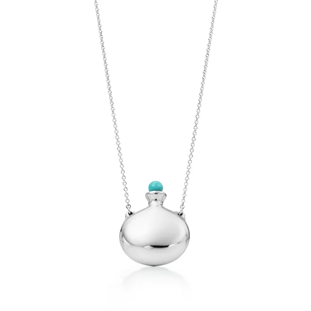 Eines der ersten Schmuckdesigns von Elsa Peretti. Anhänger in Sterlingsilber mit einem abnehmbaren Korken aus handgeschliffenem Türkis. An einer 71,1 cm langen Kette. 35 x 28 mm. Copyright der Originaldesigns bei Elsa Peretti.