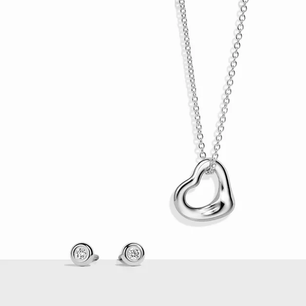 Die schlichte, aussagekräftige Form des Open Heart von Elsa Peretti trifft in diesem online-exklusiven Set auf ihre Diamonds by the Yard®-Kollektion. Der Anhänger aus Sterlingsilber wird durch ein Paar auffällige Diamantohrringe aus Sterlingsilber ergänzt. Tragen Sie die beiden Schmuckstücke zusammen, um eine maximale Wirkung zu erzielen. Das Set wird mit einer Schmuckschatulle in Tiffany Blue® geliefert.