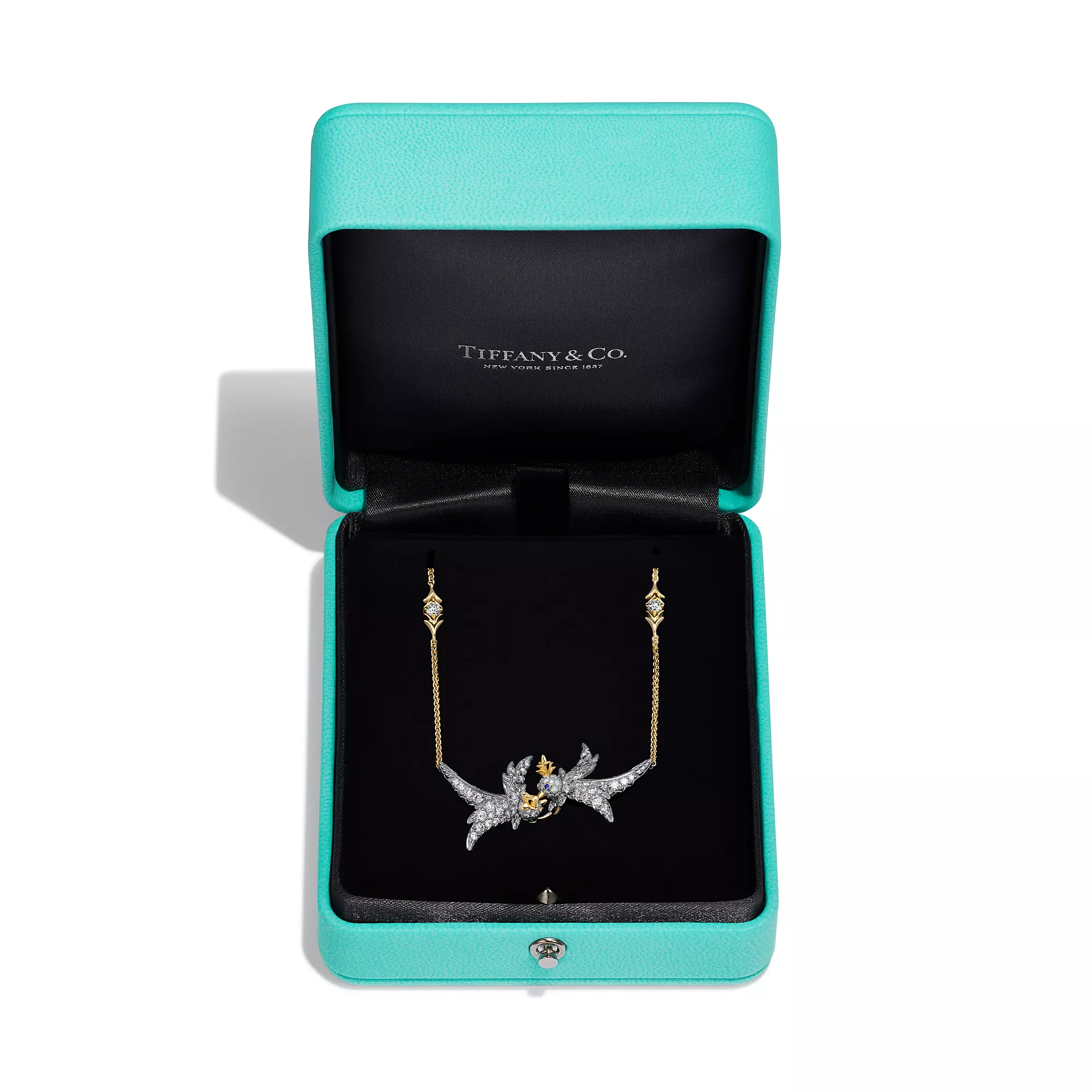 Bird on a Rock by Tiffany ist ein Symbol für den grenzenlosen Optimismus der Liebe. Jeder stilisierte Vogel ist fliegend dargestellt und erinnert an das Potenzial des Lebens, das wir sowohl allein als auch gemeinsam in einer Partnerschaft entfalten können. Dieser glänzende Anhänger in Platin und 18 Karat Gelbgold wurde sorgfältig unter Verwendung spezieller Schmucktechniken gefertigt und besticht mit markanten, skulpturalen Federn. Jedes Design fängt die anmutige Dynamik der Natur ein, die durch ein harmonisches Zusammenspiel von strahlenden Diamanten und Edelmetallen zum Leben erweckt wird. Jeder Vogel der Kollektion besticht mit Diamanten unterschiedlicher Größe, die von Hand in einer einzigartigen Anordnung gefasst werden. Dabei werden die natürlichen Unregelmäßigkeiten aufgegriffen, die Jean Schlumberger bei seinen ursprünglichen Meisterwerken als Inspiration dienten.