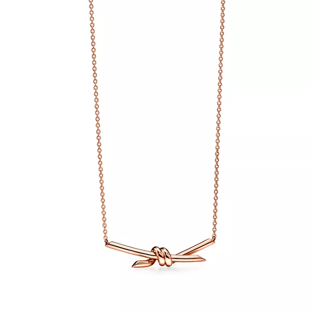 Die verschlungenen Enden des charakteristischen Tiffany Knot Motivs symbolisieren die Kraft der zwischenmenschlichen Beziehungen. Jedes Design der Tiffany Knot Kollektion ist ein komplexes Stück Handwerkskunst und bietet ein harmonisches Gleichgewicht zwischen Stärke und Eleganz. Dieser Anhänger ist aus Roségold gefertigt und wurde von Hand auf Hochglanz poliert. Tragen Sie ihn einzeln oder in Kombination mit klassischen Silhouetten für ein überraschendes Zusammenspiel.