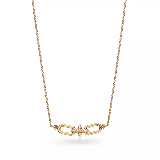 Mit Tiffany Titan by Pharrell Williams – einer Kollektion, die Rebellion als Katalysator für Kreativität zeigt – knüpft das Haus an seine Tradition der Zusammenarbeit mit visionären Künstlern an. Diese Designs sind inspiriert von Poseidon und seinem Dreizack. Ein eckiges, speerförmiges Motiv und weich konturierte Glieder sind für einen atemberaubenden Look in 18 Karat Gelbgold gefertigt. Pavé-Diamanten in Fishtail-Fassung lassen das Licht von allen Seiten einfließen, um maximale Brillanz zu erzeugen.