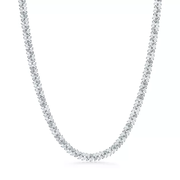 Mit einer Intensität, die den Sternen am Nachthimmel gleicht, zelebriert Tiffany Victoria® die leuchtende Brillanz von Tiffany Diamanten. Diese Halskette, deren Weinreben-Motiv mit funkelnden, unterschiedlich geschliffenen Diamanten zum Leben erweckt wird, ist eine raffinierte Ergänzung zu jedem Outfit.