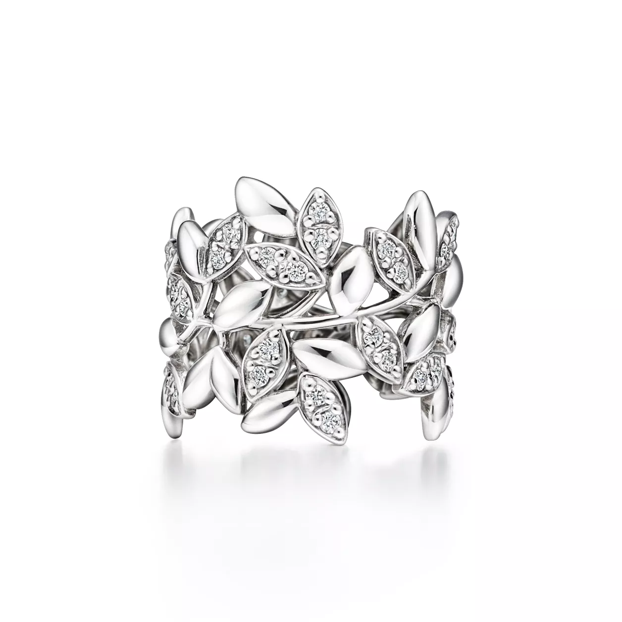 Mit schön geformten Diamantblättern ehrt Paloma den Ölzweig als Symbol für Frieden und Fülle. Bandring aus 18 kt. Weißgold mit runden Brillanten. Gesamtkaratgewicht 0,46 kt. Copyright der Originaldesigns by Paloma Picasso®.