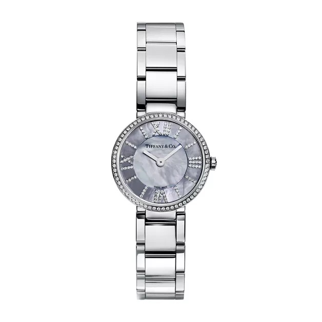 Inspiriert von den klaren Linien der römischen Ziffern in der Uhr über dem Eingang des Tiffany Flagship Store an der Fifth Avenue, verbindet die Atlas® Uhrenkollektion grafische Klarheit mit funktionaler Eleganz für Stücke, die ganz einfach jeden Tag getragen werden können. Diese runde 24-mm-Uhr ist aus Edelstahl mit raffinierten Diamant-Akzenten und einem Zifferblatt mit grauem Perlmutt gestaltet und stellt damit eine moderne Neuauflage eines kraftvollen und elementaren Designs dar.