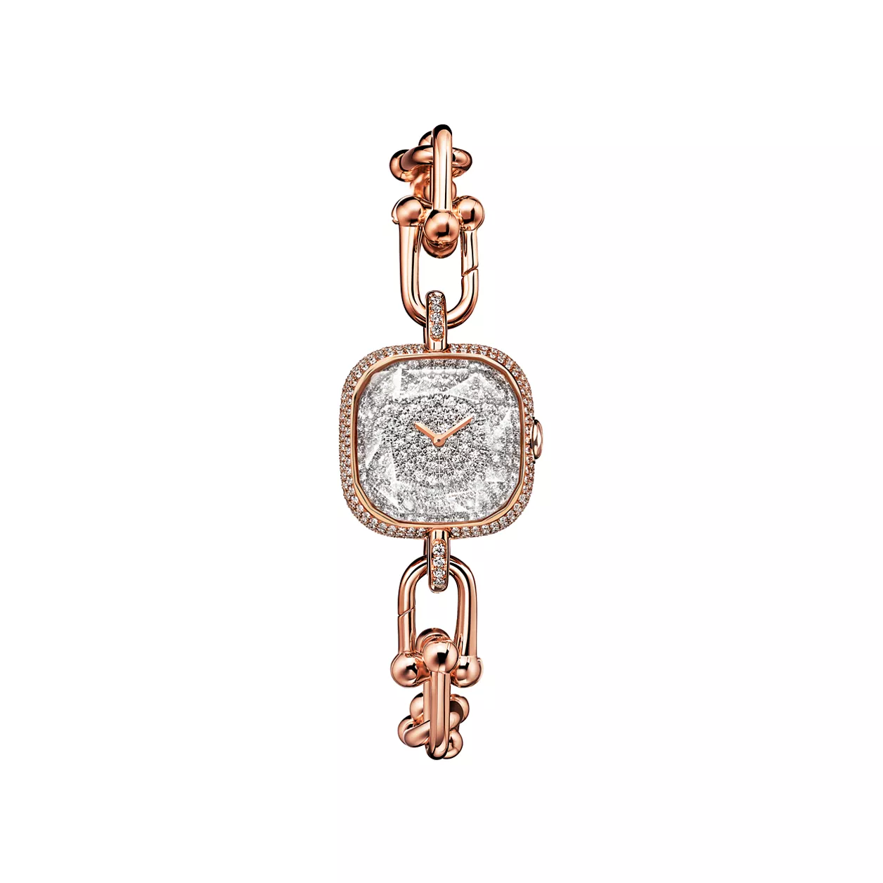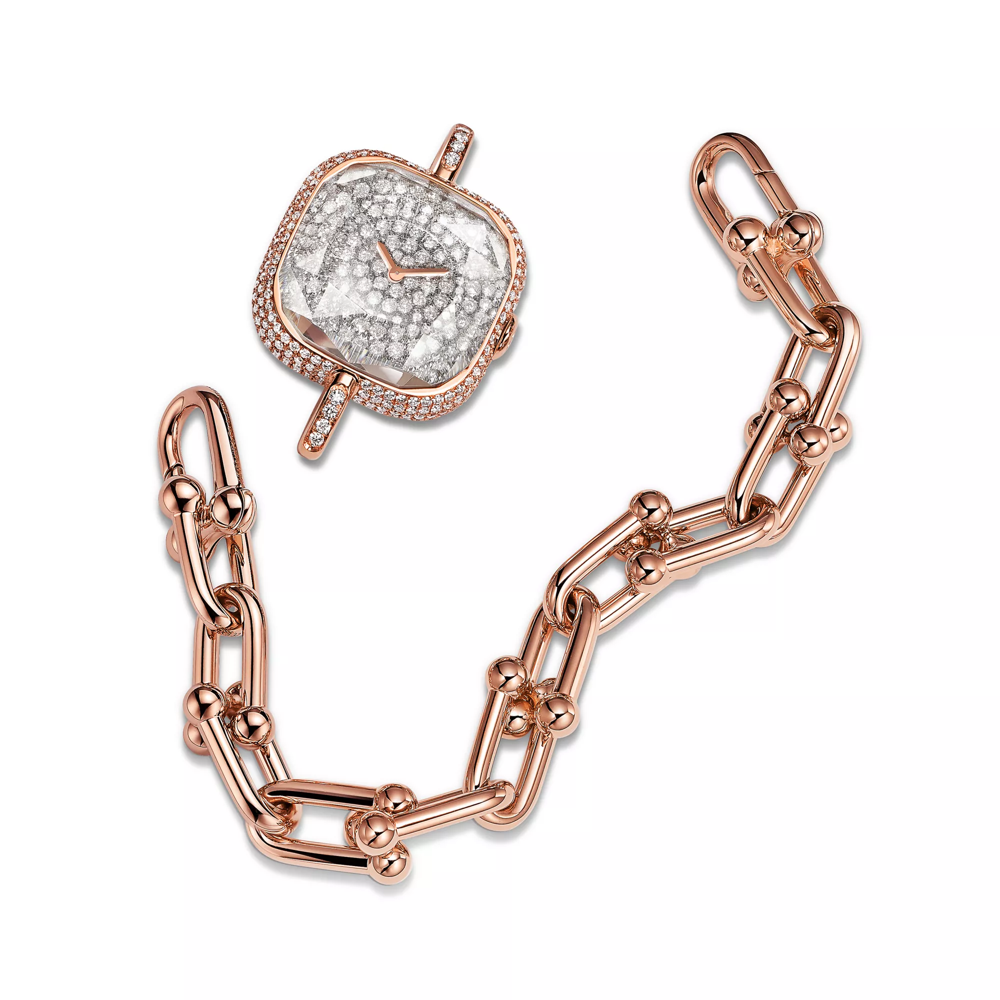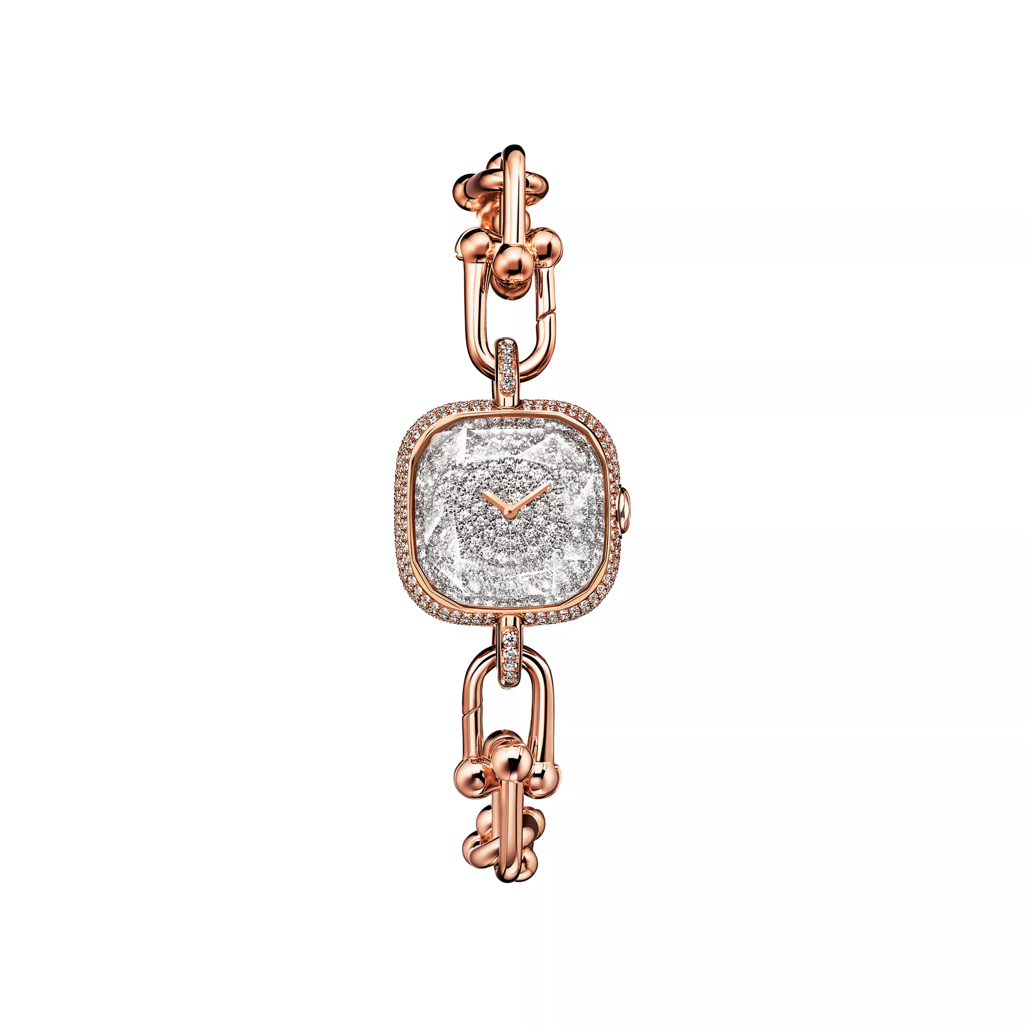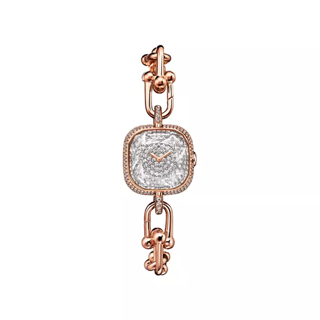 Tiffany HardWear ist ein Symbol der Verwandlungskraft der Liebe. Inspiriert durch ein Armband aus dem Jahr 1962, das man in den Archiven des Hauses fand, verkörpert HardWear dauerhafte Widerstandsfähigkeit und ungehemmten Geist. Die in der Schweiz handgefertigten Tiffany HardWear Uhren überzeugen mit den ikonischen Kettengliedern und Diamanten im Brillantschliff. Diese Uhr in 18 Karat Roségold besticht mit einem Pavé-Diamant-Zifferblatt. Ein versteckter Schnappverschluss sorgt für ein schlankes Design, während ein facettiertes Saphirkristallglas an die einzigartige Form des legendären Tiffany Diamanten erinnert. Als Einzelstück oder in Kombination mit Tiffany HardWear Armbändern und Armreifen ist sie ein wunderschöner Blickfang.