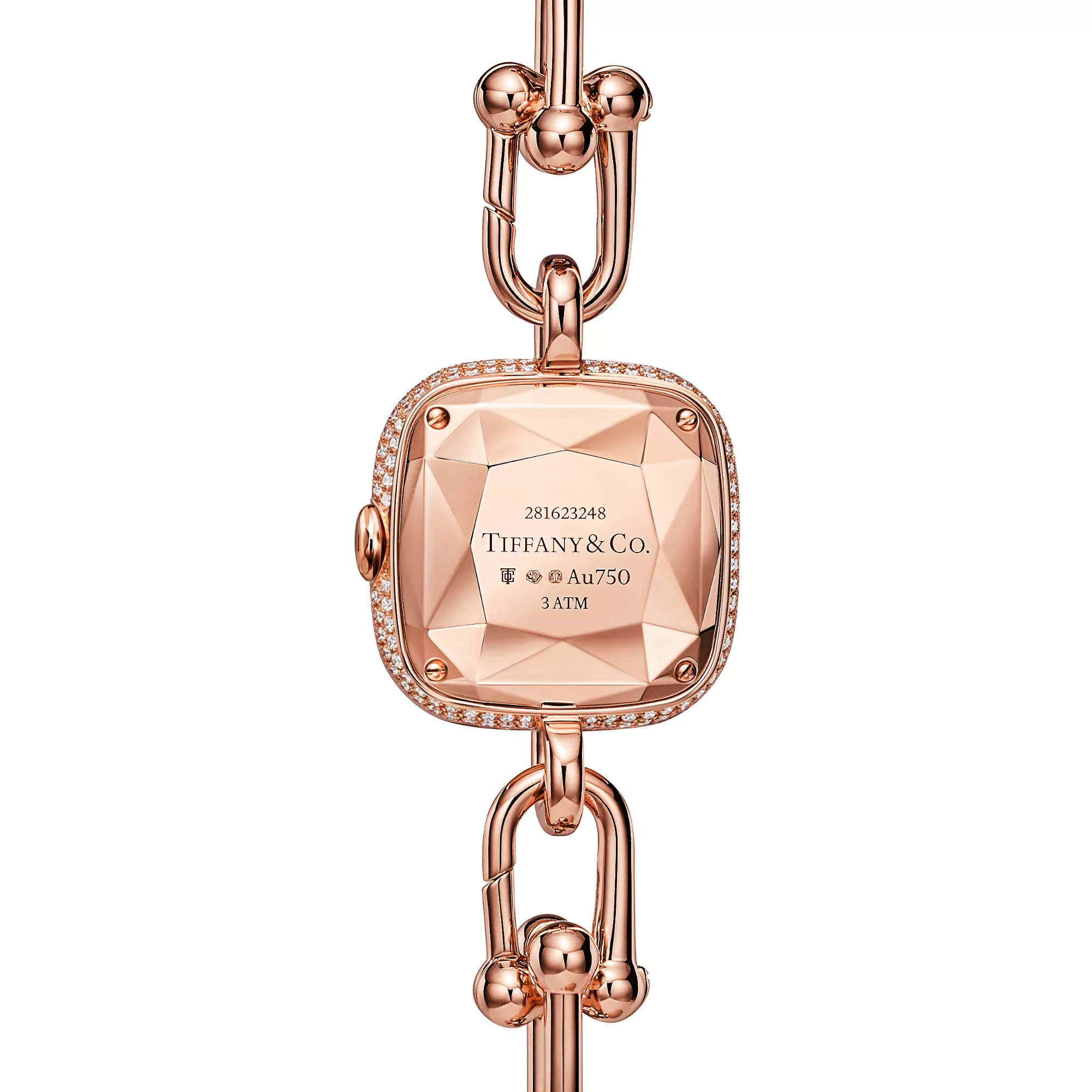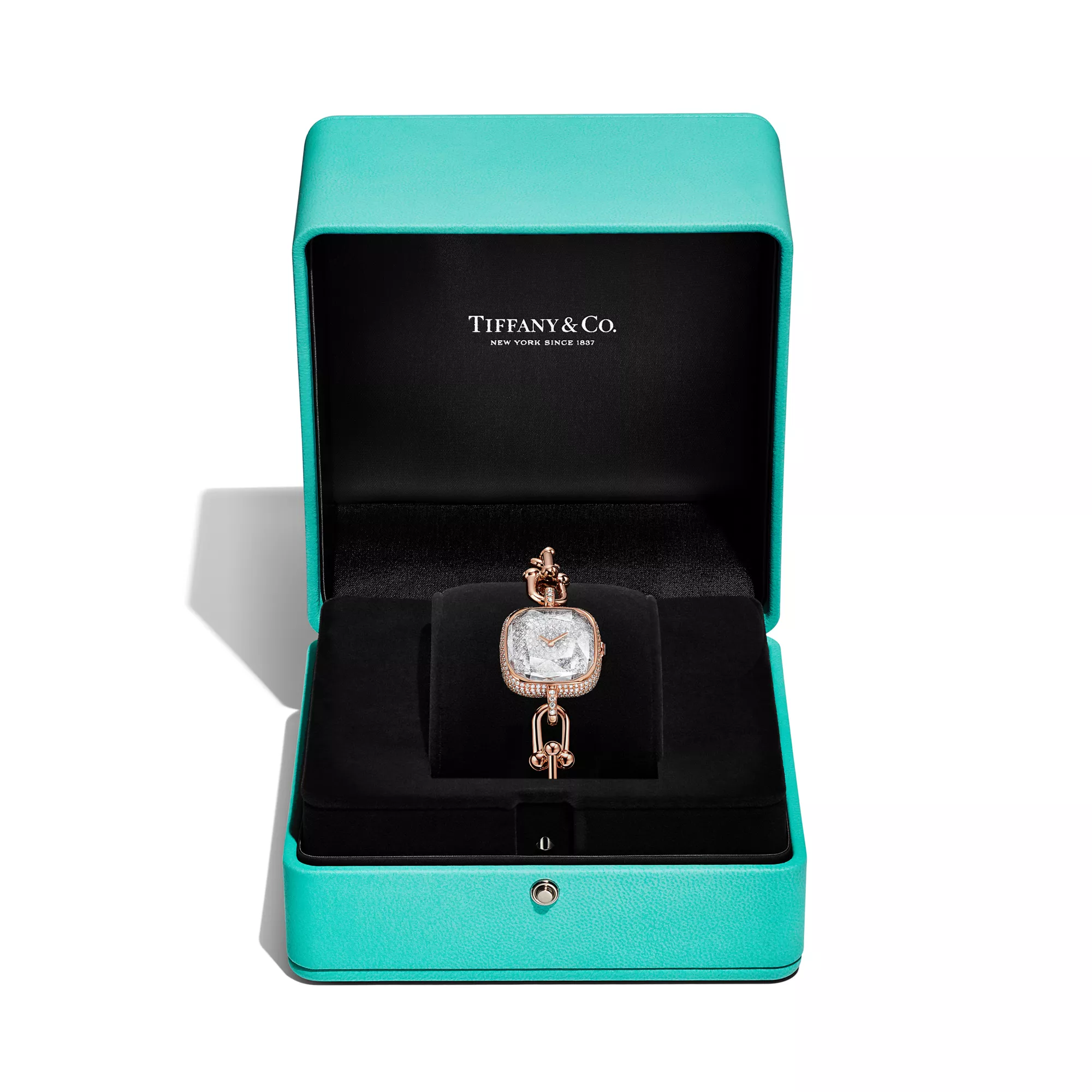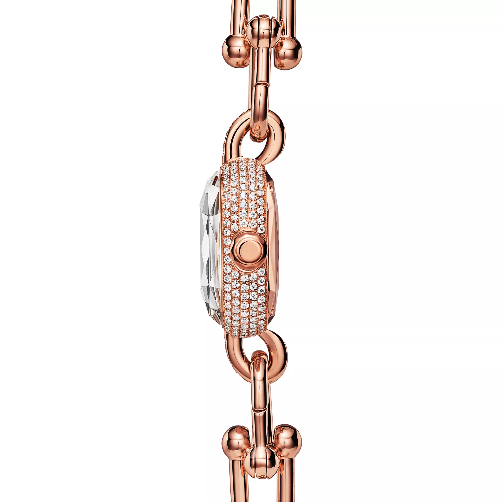 Tiffany HardWear ist ein Symbol der Verwandlungskraft der Liebe. Inspiriert durch ein Armband aus dem Jahr 1962, das man in den Archiven des Hauses fand, verkörpert HardWear dauerhafte Widerstandsfähigkeit und ungehemmten Geist. Die in der Schweiz handgefertigten Tiffany HardWear Uhren überzeugen mit den ikonischen Kettengliedern und Diamanten im Brillantschliff. Diese Uhr in 18 Karat Roségold besticht mit einem Pavé-Diamant-Zifferblatt. Ein versteckter Schnappverschluss sorgt für ein schlankes Design, während ein facettiertes Saphirkristallglas an die einzigartige Form des legendären Tiffany Diamanten erinnert. Als Einzelstück oder in Kombination mit Tiffany HardWear Armbändern und Armreifen ist sie ein wunderschöner Blickfang.