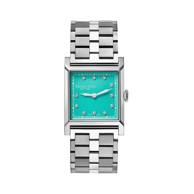 Die Union Square Uhrenkollektion ist eine Hommage an Tiffanys Wurzeln in Downtown New York. Eine Interpretation von The Landmark ist auf dem Gehäuseboden zu sehen, während die T-förmige Schließe eine einzigartige Tiffany & Co. Ästhetik bietet. Diese 27-mm-Uhr besticht mit einer Edelstahlkrone mit Tiffany Blue® in der Mitte und Diamanten im runden Brillantschliff.